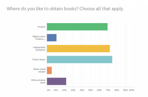 My survey also asked where people buy or otherwise obtain books. Yes, my readers shop at Amazon, but that option ranked third. Public libraries received the most votes, followed by indie bookstores.