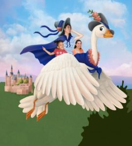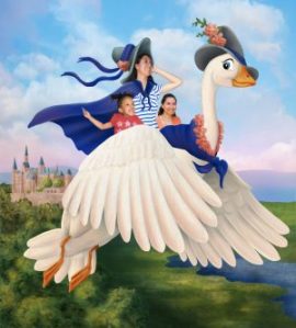 Once the goose was done, I started working on her scarf along with the cape and hat of Mother Goose. I wanted them to coordinate to really tie these two characters together visually. I pulled the blue from the striped shirt the young lady in the photograph was already wearing and built from there. As I was working, I felt like the goose also needed a hat and some other embellishments. The flowers were just the right touch. I was inspired by looking at some references of carousel animals.
