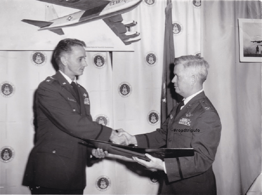 I am Richard M. Evans, son of Colonel Ivor Parry Evans, ex-base commander of the Air Force base at Roswell, NM. The photo shows my dad shaking hands with Major General Douglas Nelson, ex-commander of Area 51.