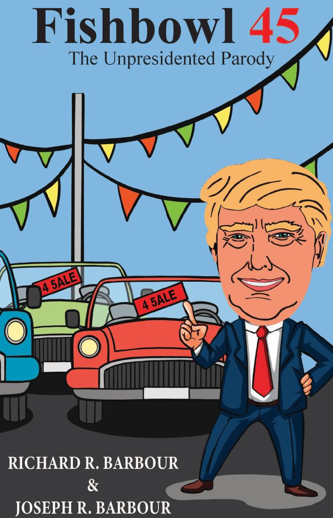 In *FISHBOWL 45*, authors Richard R. Barbour and Joseph R. Barbour craft a satirical narrative that mirrors contemporary American politics through the lens of a struggling used car dealership. The protagonist, Donald J. Fish, is a proud Republican and the president of Fishbowl Motors, a dealership specializing in pre-owned luxury cars with the patriotic pitch, “Buy American! Let’s Make America Great Again!”